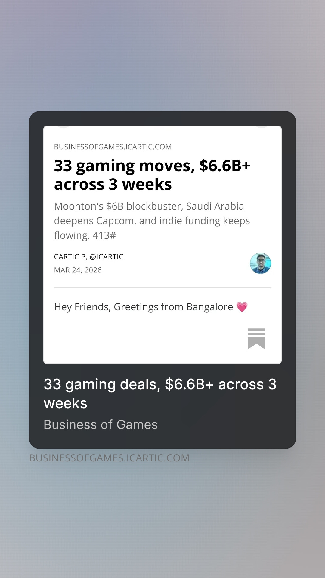 Moonton's $6B blockbuster, Saudi Arabia deepens Capcom, and indie funding keeps flowing. 413#
