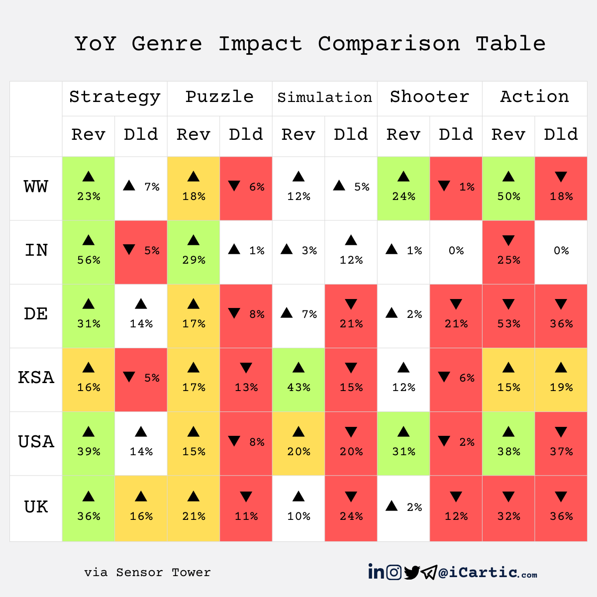 Growth across genres by rev and downloads across the DE, US, UK, IN, and KSA markets.