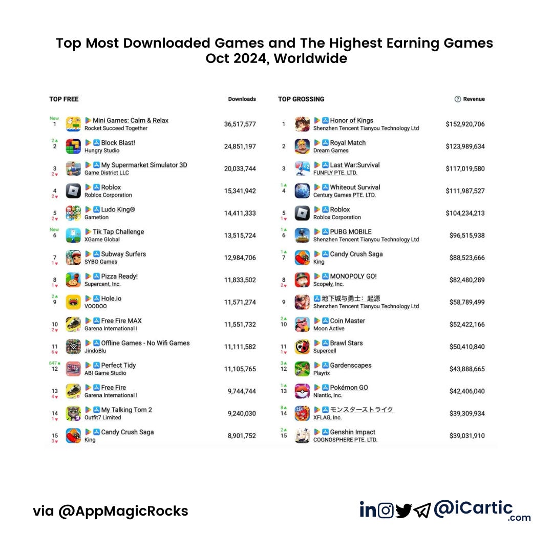 💰Highest earning games and 🎯 most downloaded games of Oct 2024.