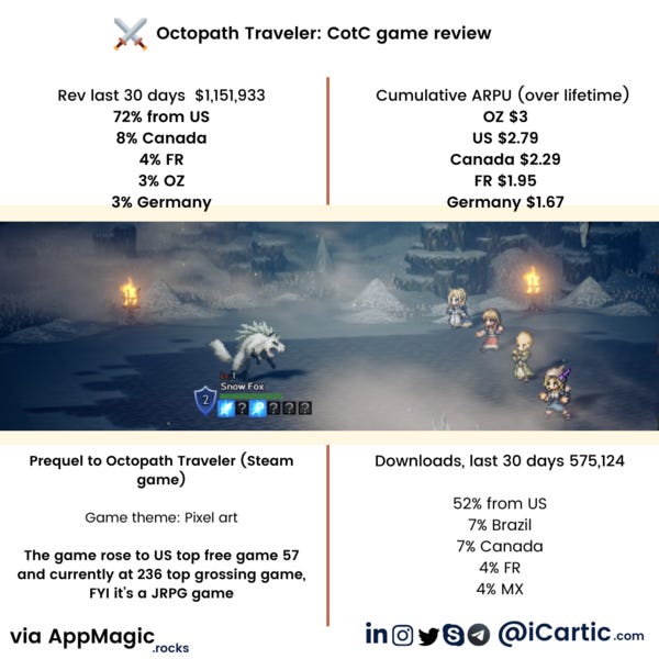 Interesting top 250 grossing entrants on the market, Square Enixβs turn-based RPG, Octopath Traveler: CotC