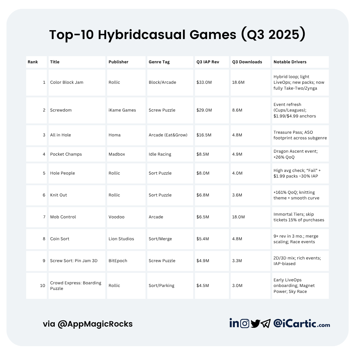 Puzzle/Sort/Block/Screw cluster dominates: Color Block Jam; Screwdom; Screw Sort Puzzle: Pin Jam 3D; Knit Out; Hole People; Coin Sort; Crowd Express.