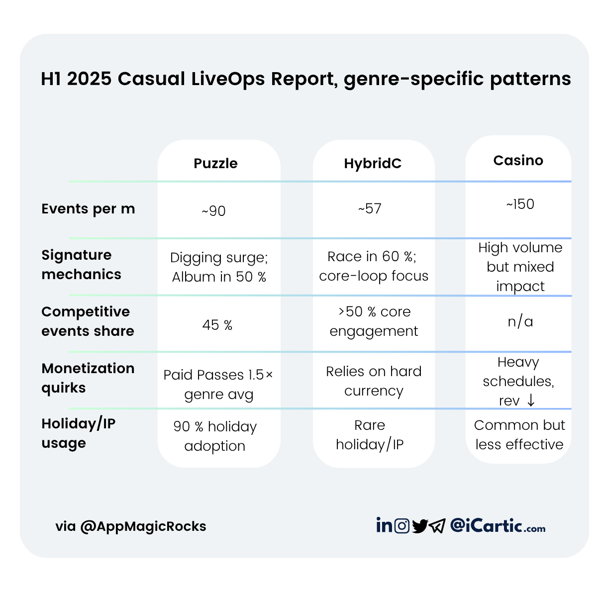 2. Genre winners & losers: Puzzle revenue ↑ 13.2 %; Hyper-casual IAP revenue ↑ 111 % (from deeper meta monetisation); Casino revenue ↓ 15.5 %